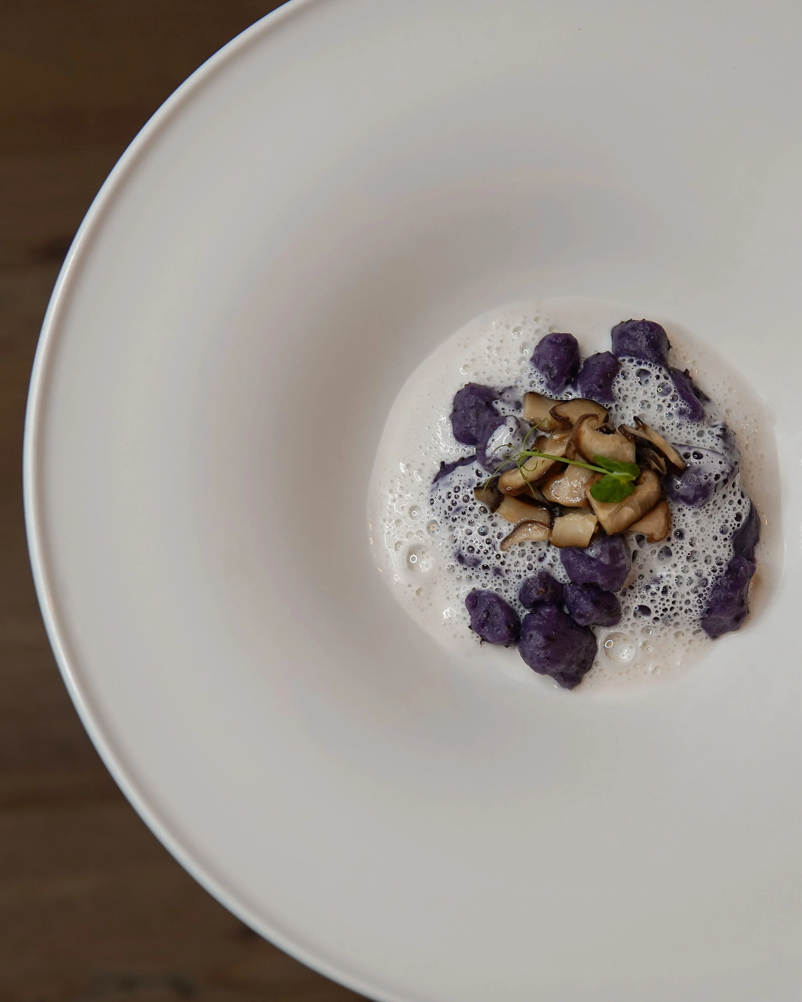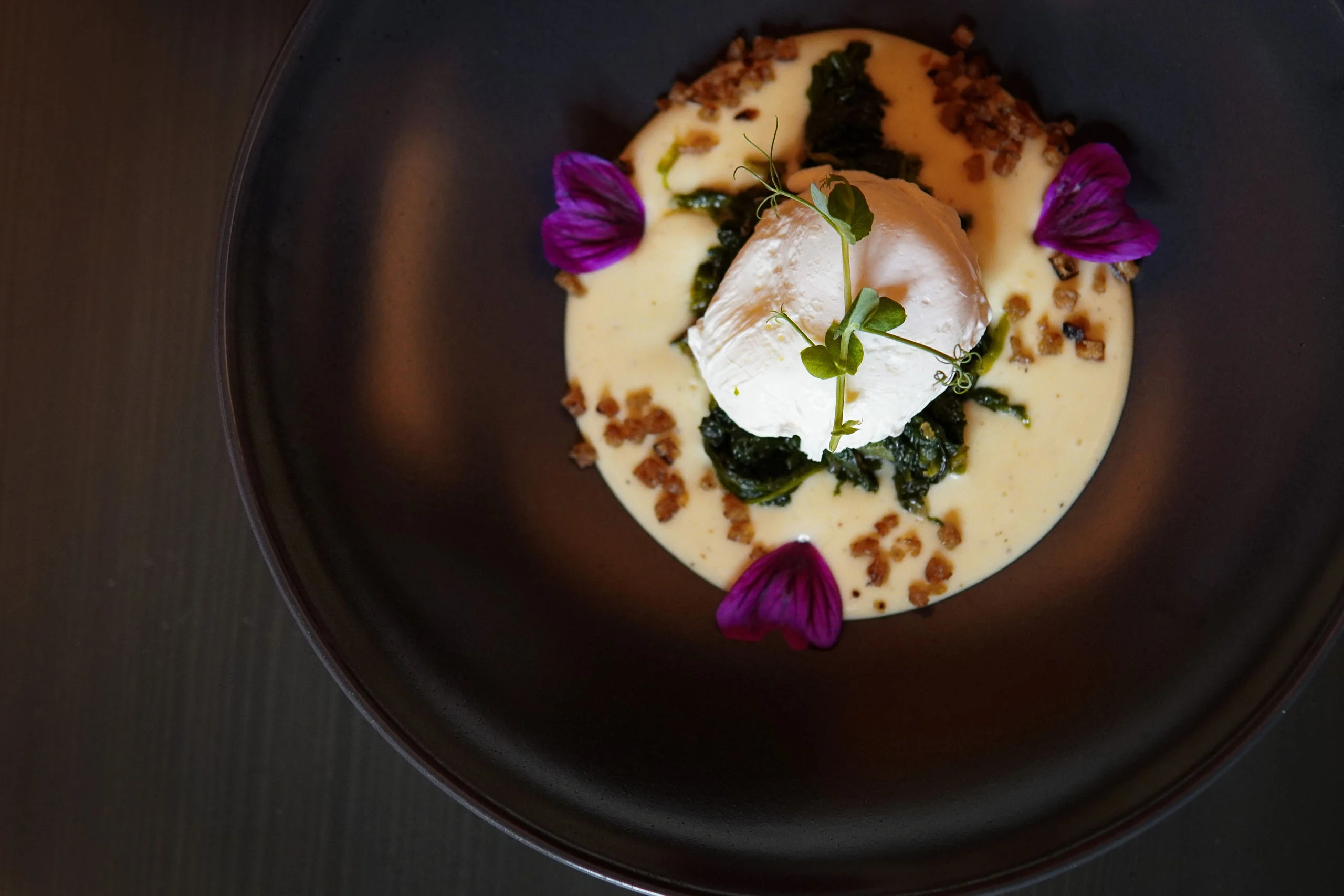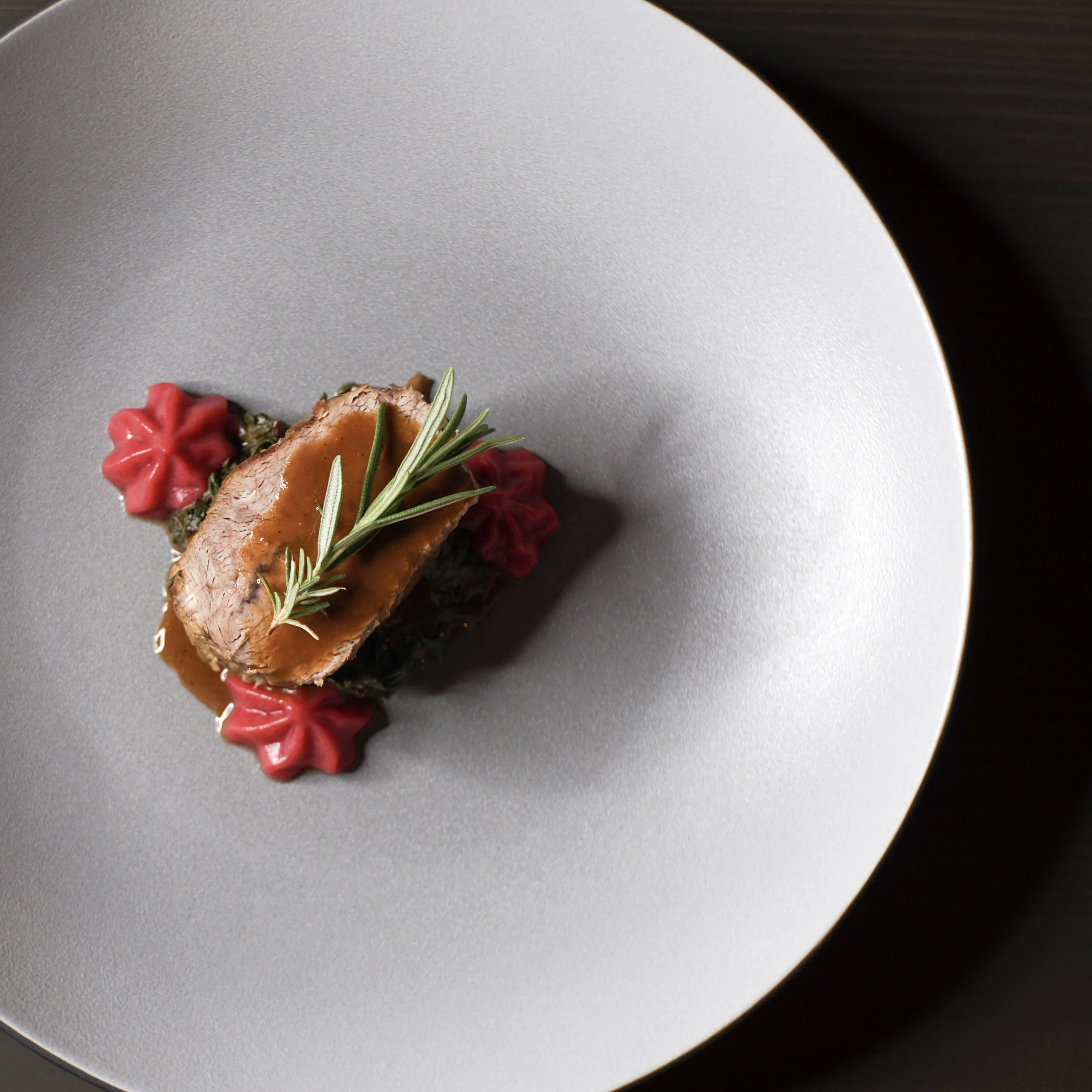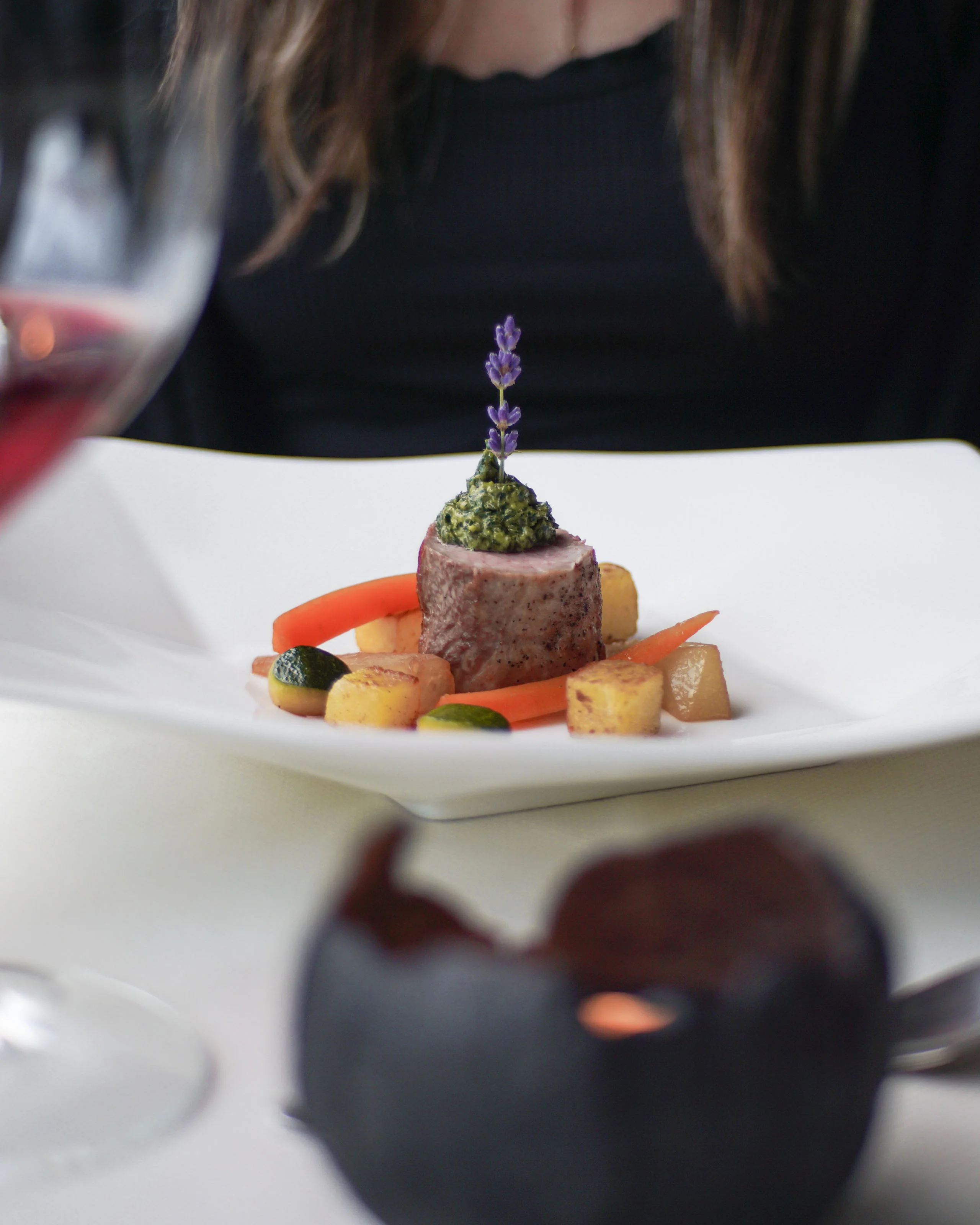 Fein angerichtetes Gericht mit Fleisch, Gemüse und einer Lavendelblüte auf weißem Teller