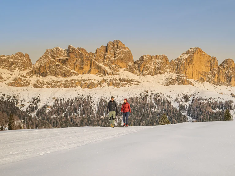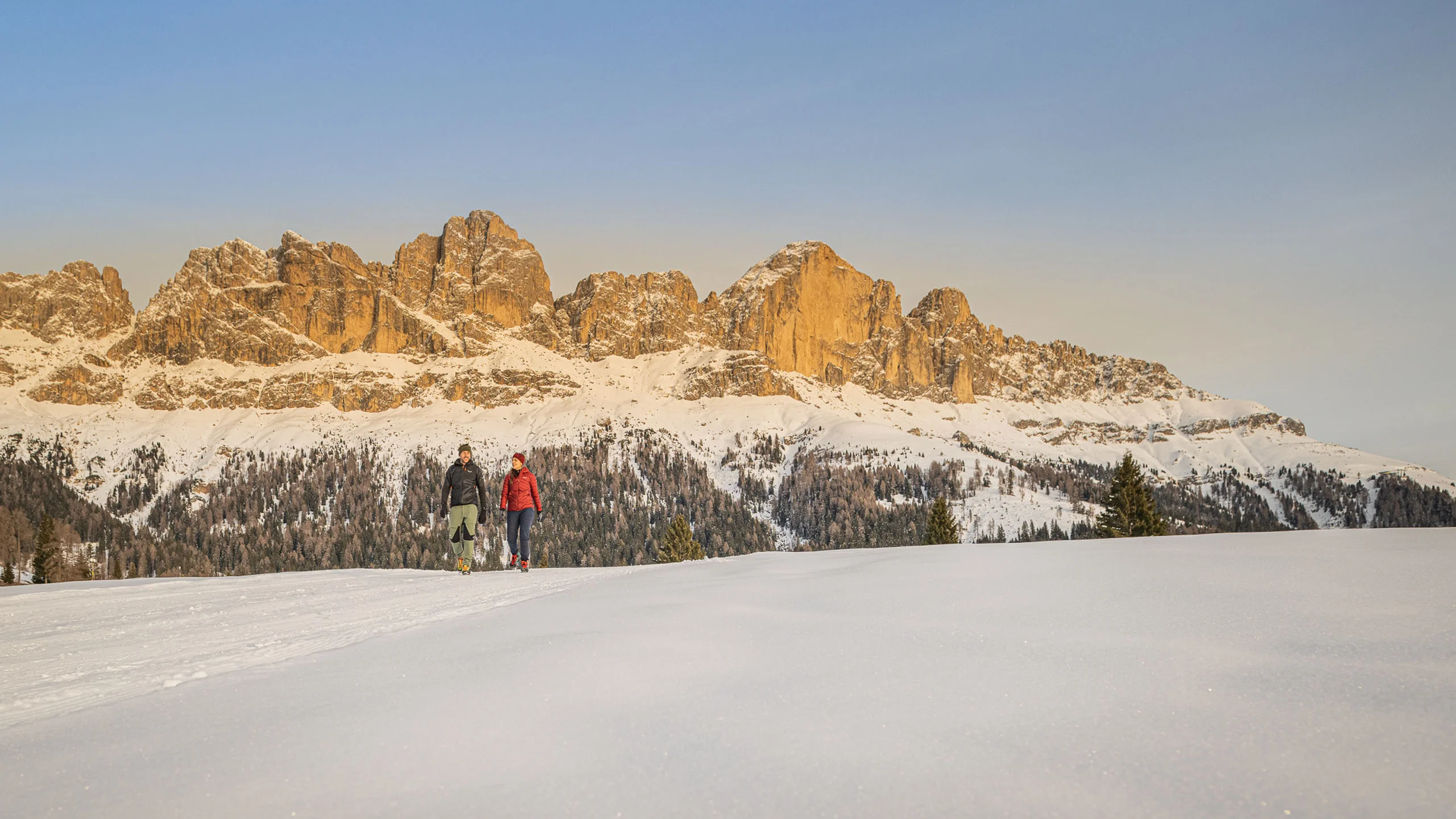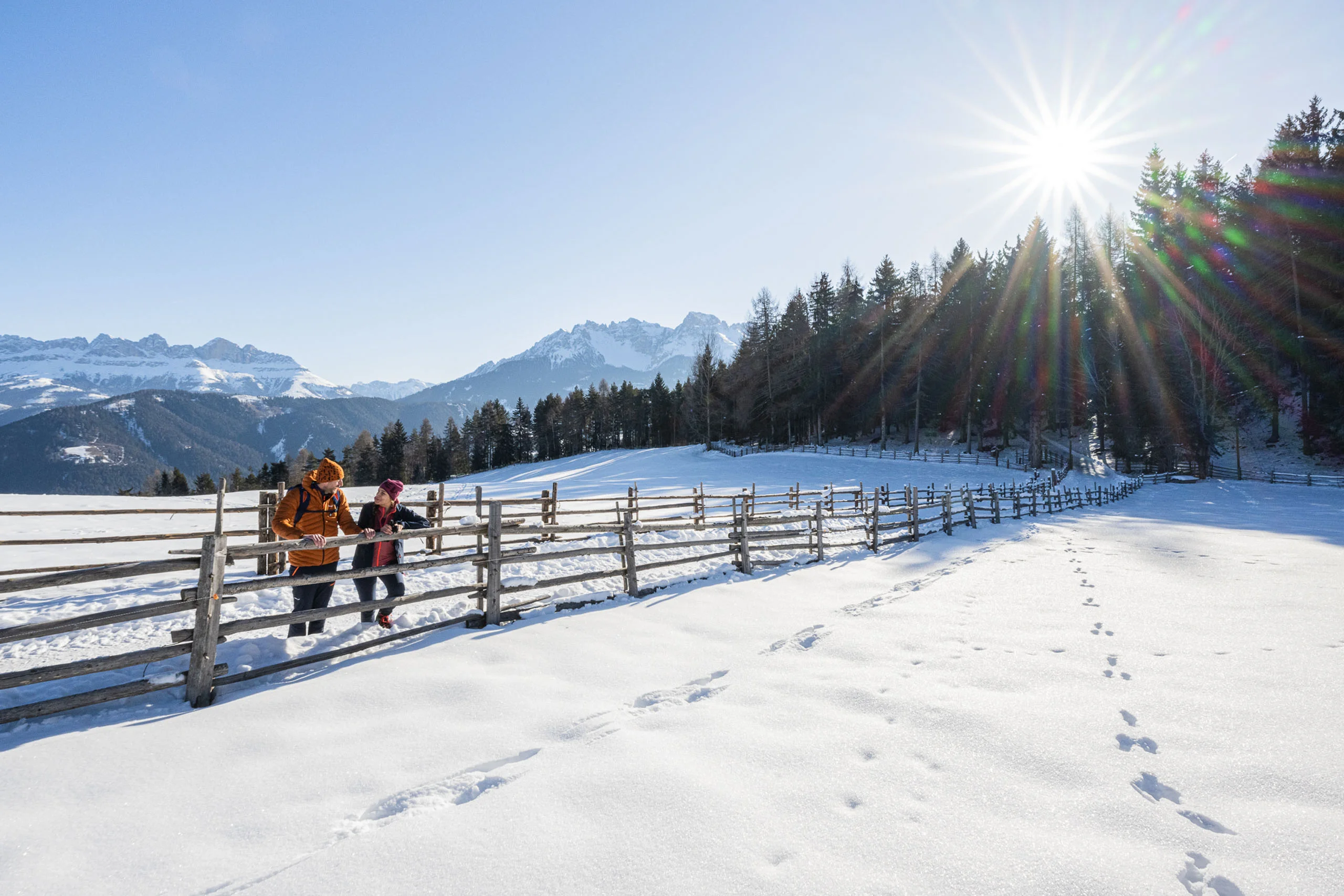 Das Friedrich liegt in Welschnofen, einem Dorf im Eggental, das euch die Dolomiten praktisch auf dem Silbertablett serviert. Morgen- und Abendsonne den ganzen Tag lang, dazu der Traumblick auf Rosengarten und Latemar. Die Umgebung zeigt sich ruhig, authentisch und dabei herrlich zugänglich. Skipisten erreicht ihr in wenigen Minuten, Winterwanderwege starten direkt vor der Haustür. Schneeschuhtouren zu stillen Seen, Langlaufloipen durch verschneite Wälder, unberührte Natur zum Durchstreifen – alles liegt in direkter Reichweite. Abends sitzt ihr im warmen Pool, schaut zu, wie die Berge rosa werden, und spürt: Genau so soll Winter sein.