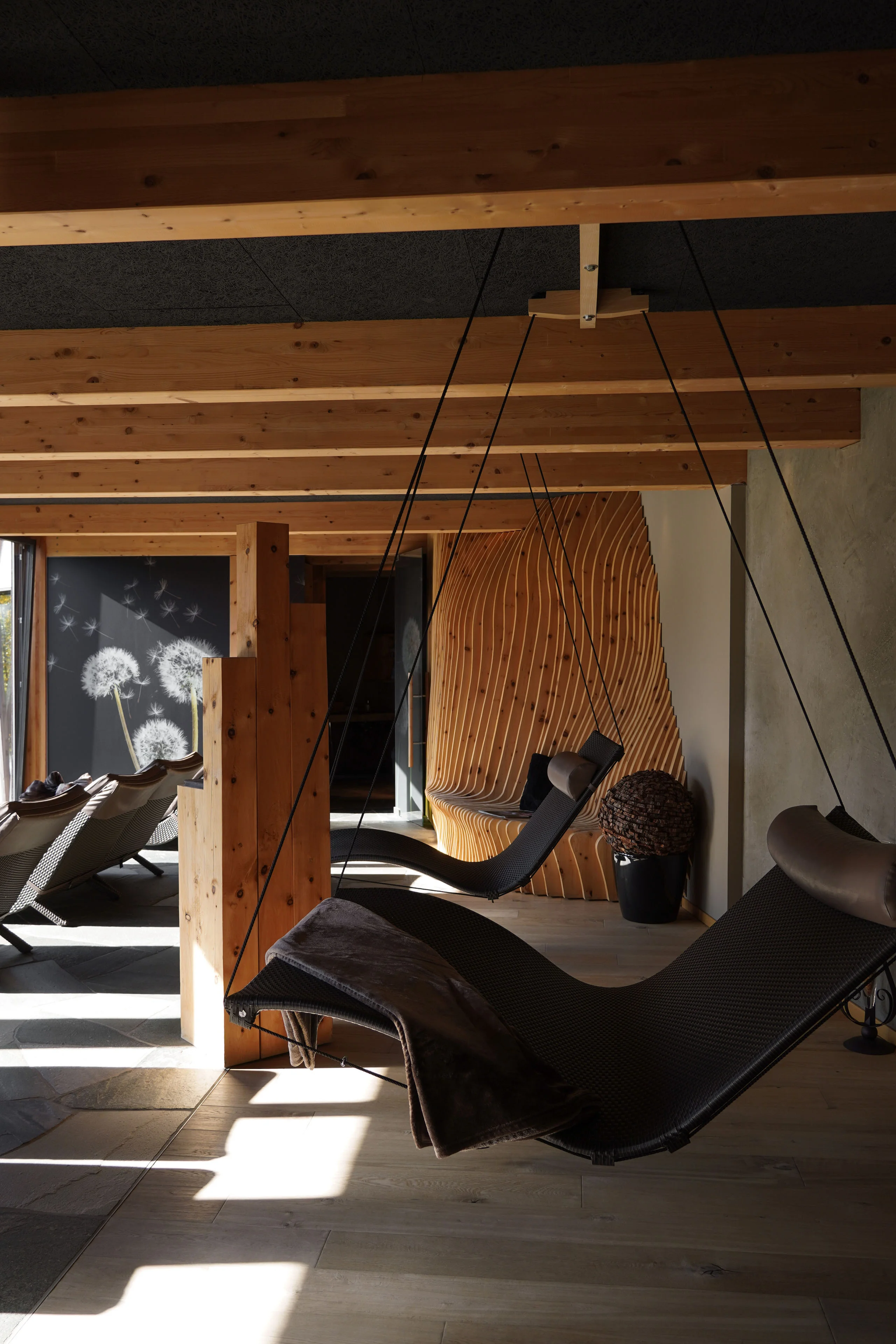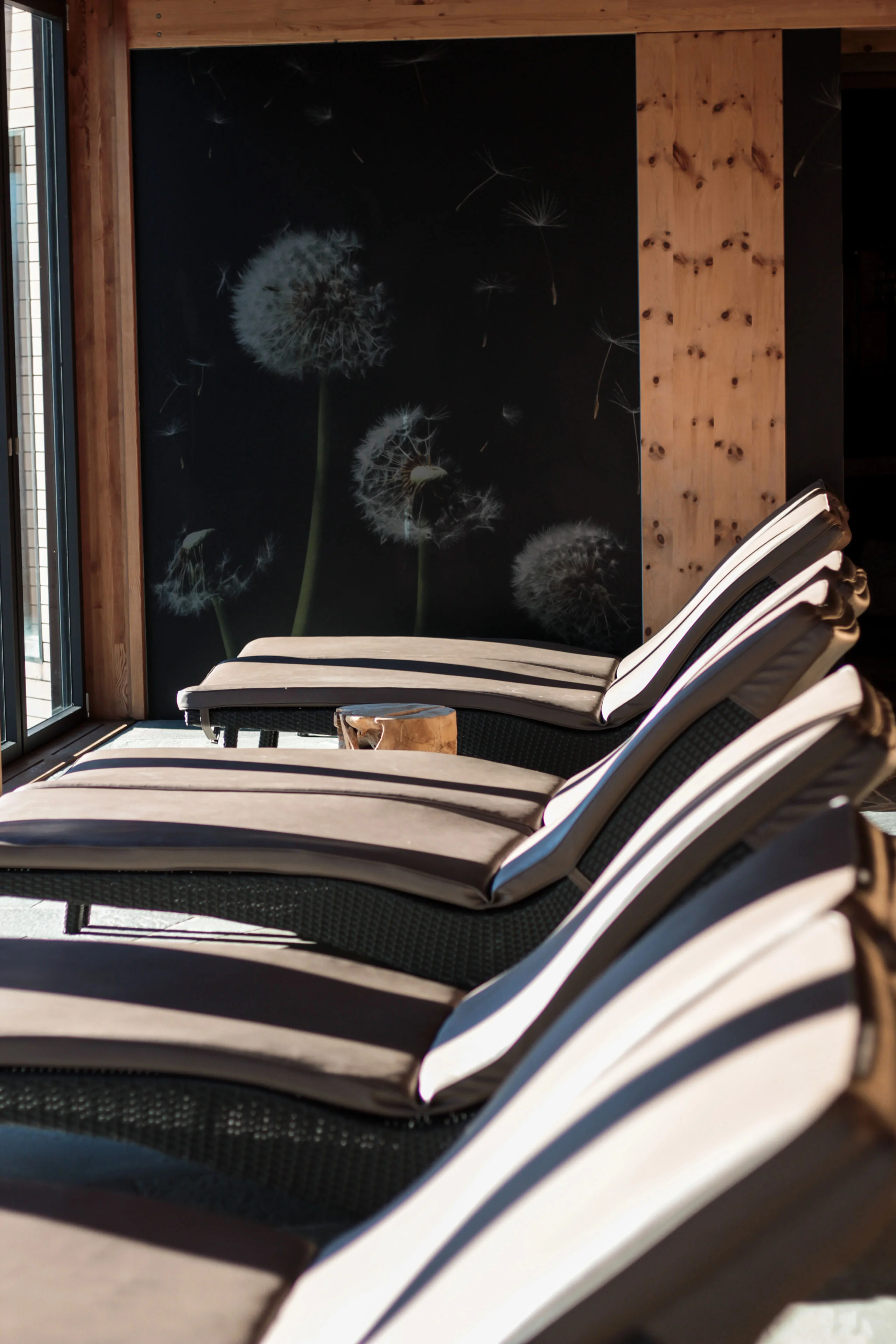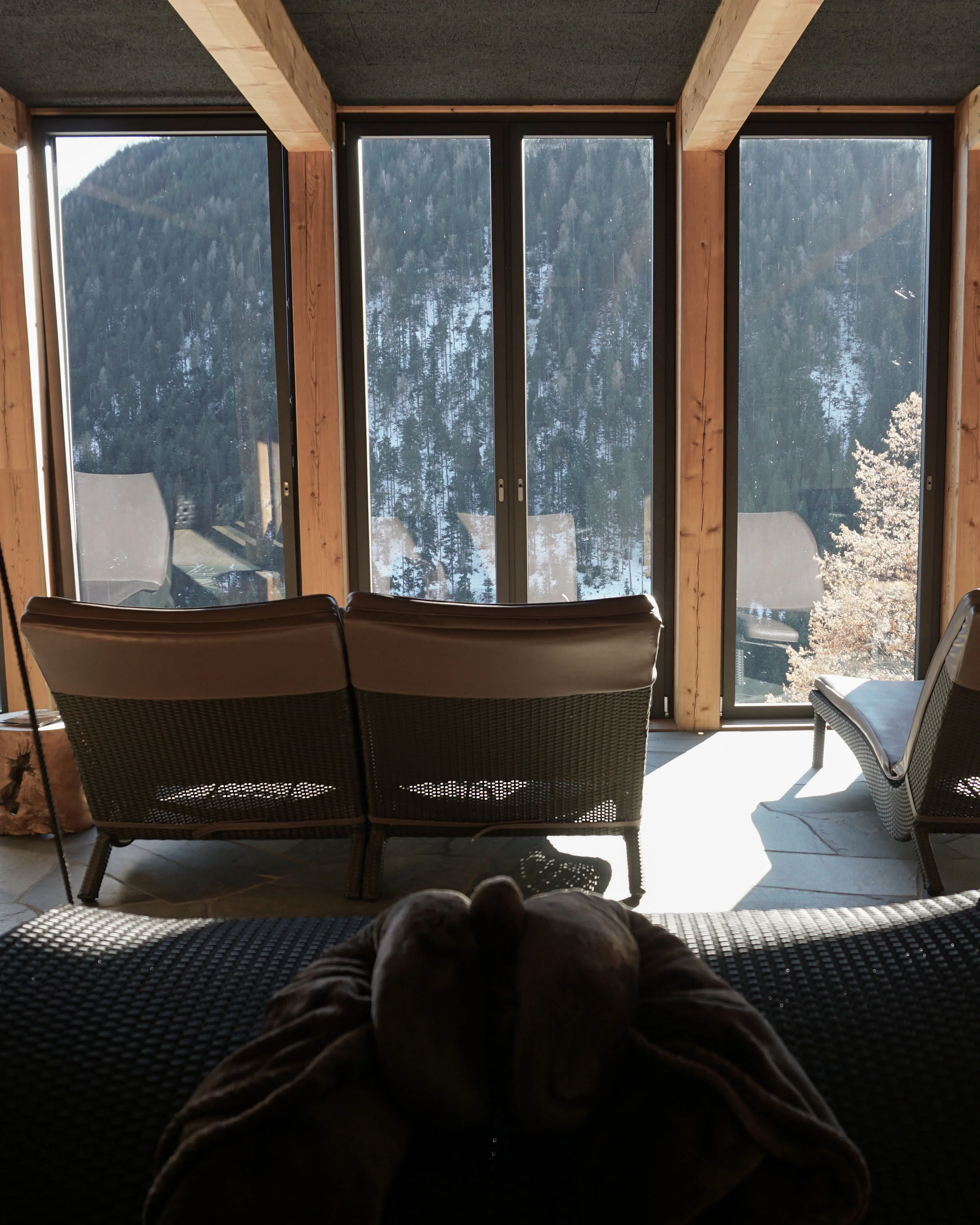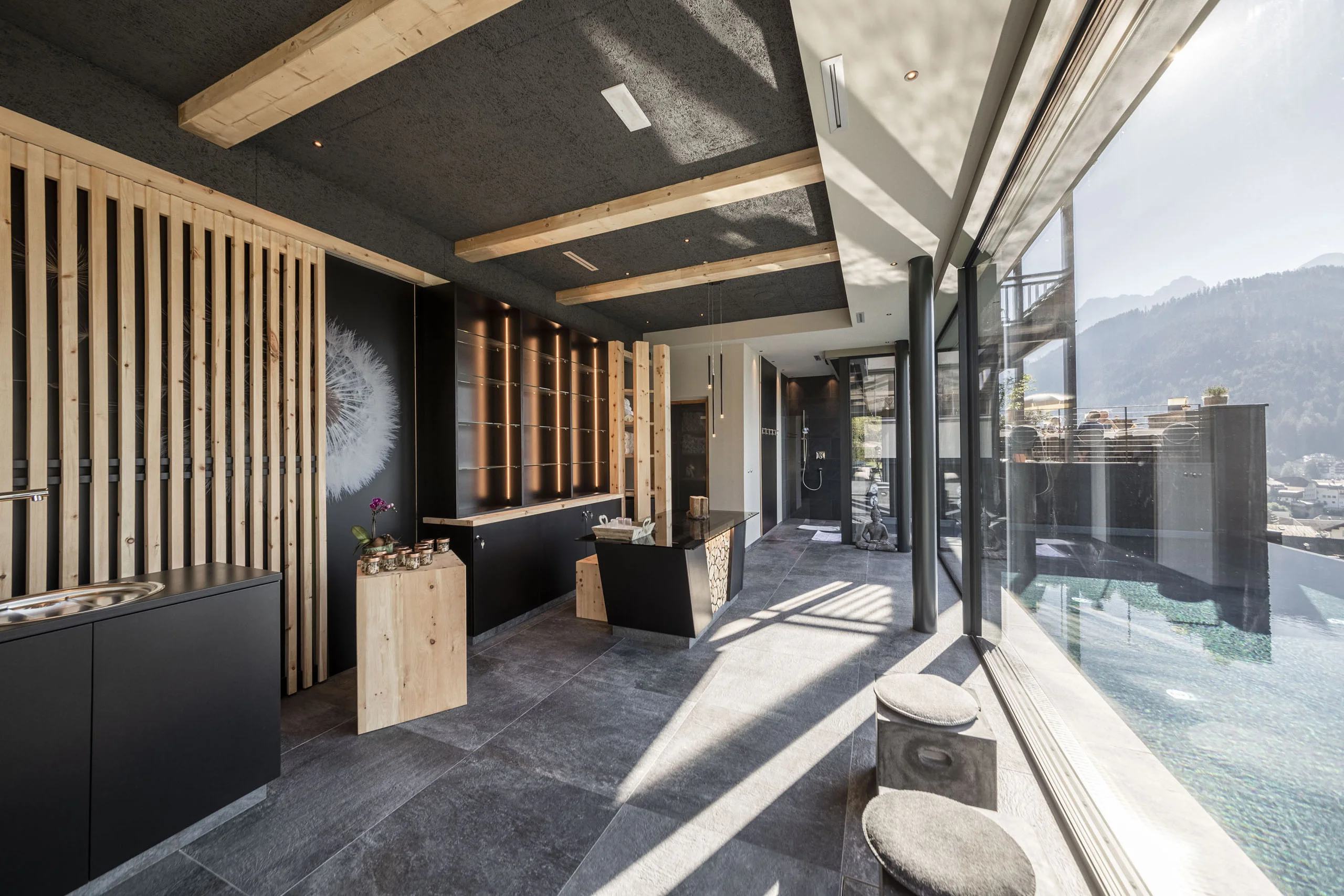 Der Wellnessbereich erstreckt sich über zwei Ebenen und ist großzügig. Der beheizte Infinity-Pool mit Massagebank lässt euch bis zu den Dolomiten schwimmen (zumindest fühlt es sich genau so an), während die Panorama-Sauna euch mit Postkartenblick auf den Rosengarten richtig einheizt. Dampfbad und Infrarotkabine stehen bereit, wenn euch nach Tiefenwärme ist, der halb-offene Ruhebereich bringt frische Winterluft rein, und die Teebar versorgt euch zwischendurch mit vitalen Snacks. Das absolute Highlight? Die Silberquarzit-Rituale. So einfach und so wirkungsvoll muss Wellness sein.