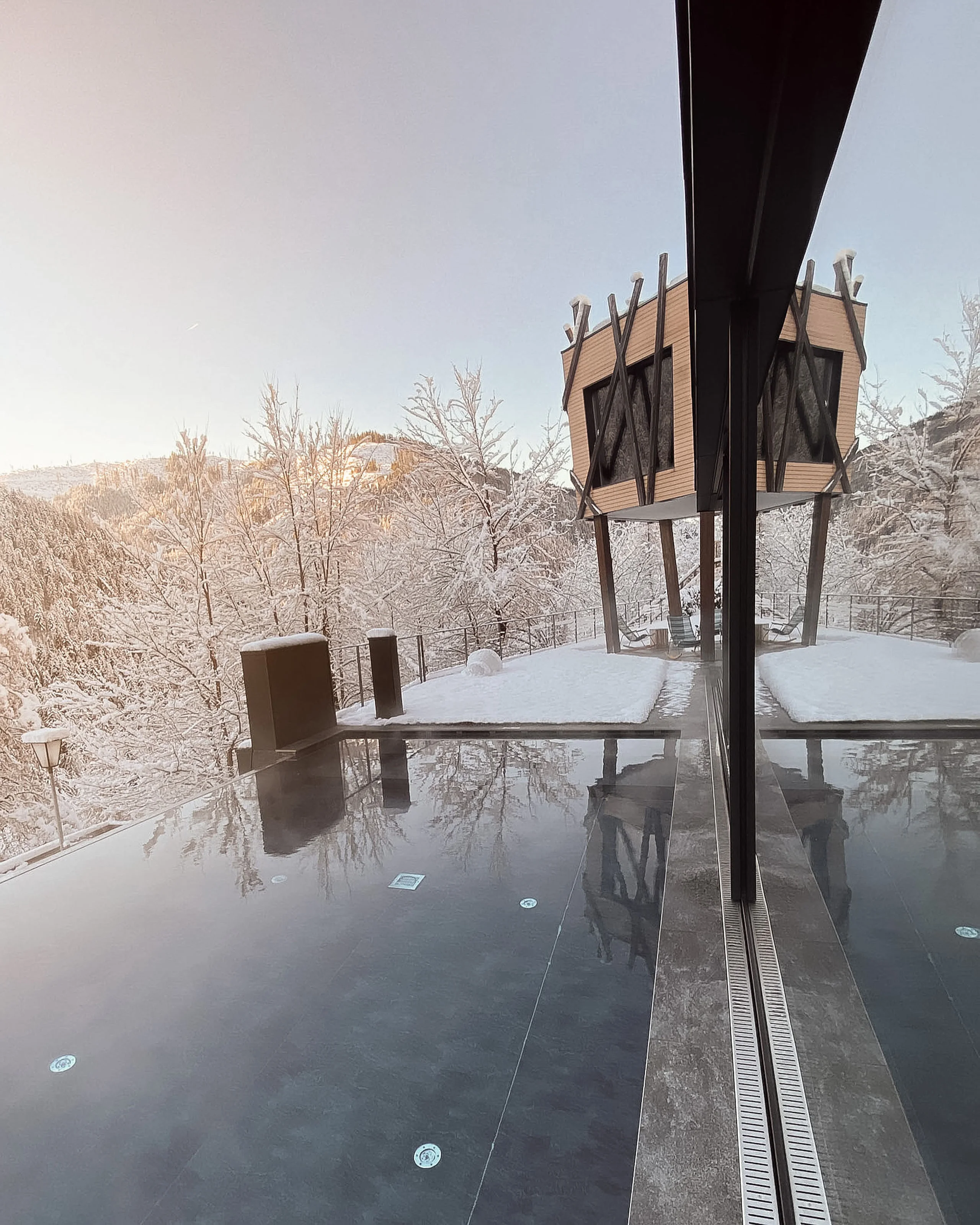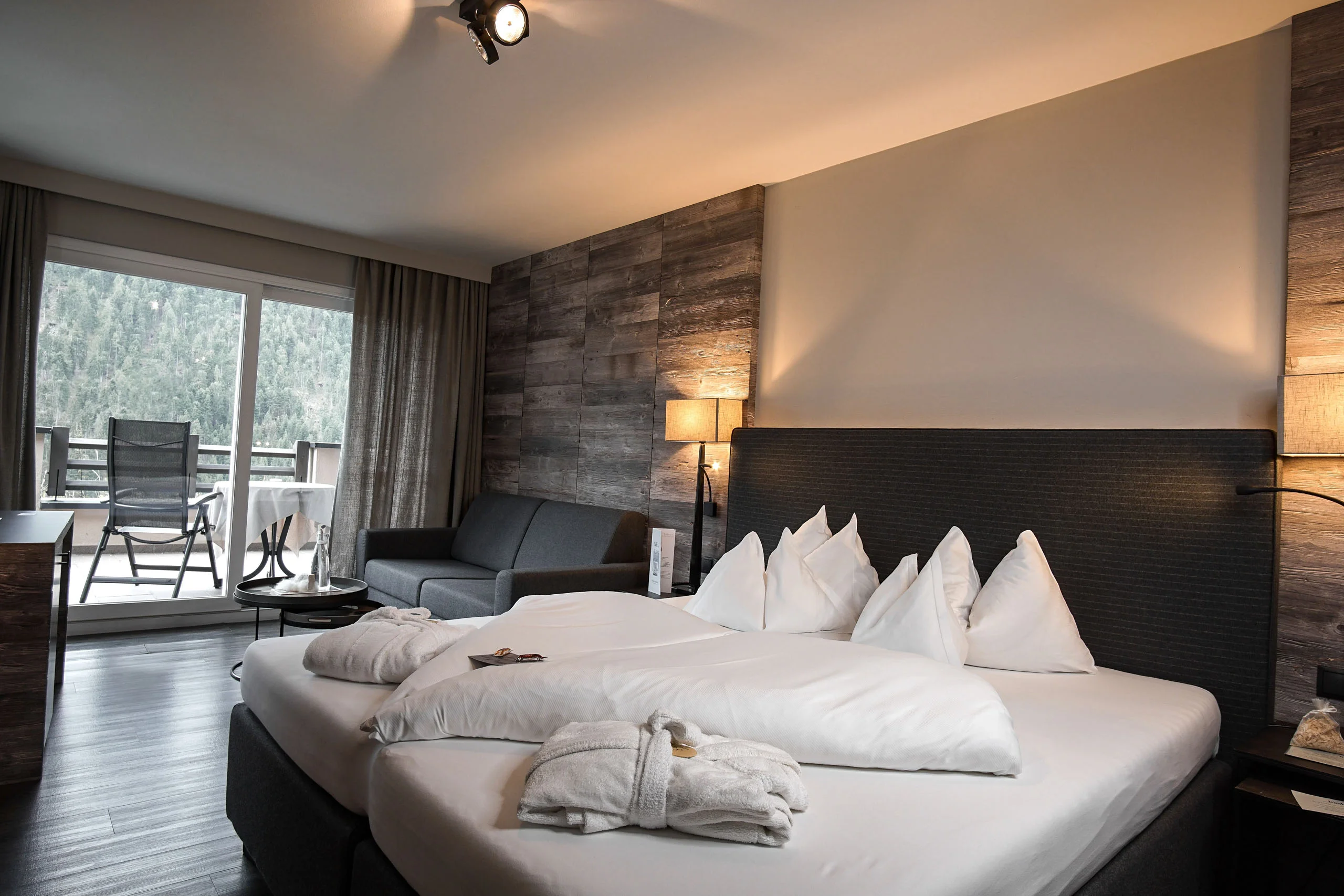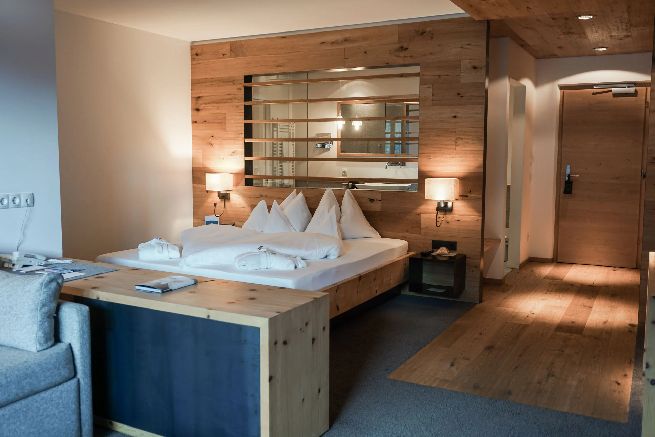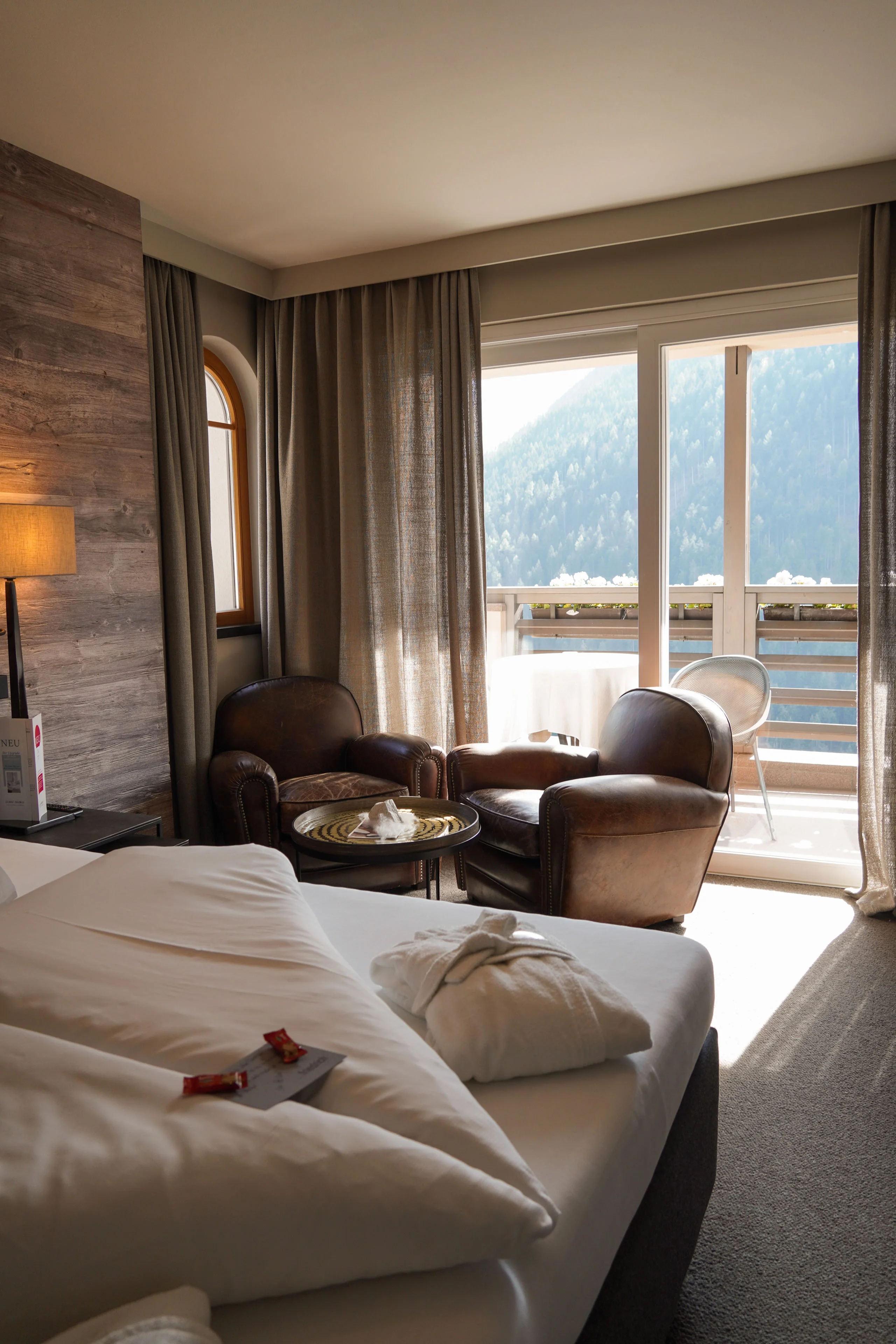 Der Wellnessbereich erstreckt sich über zwei Ebenen und ist großzügig. Der beheizte Infinity-Pool mit Massagebank lässt euch bis zu den Dolomiten schwimmen (zumindest fühlt es sich genau so an), während die Panorama-Sauna euch mit Postkartenblick auf den Rosengarten richtig einheizt. Dampfbad und Infrarotkabine stehen bereit, wenn euch nach Tiefenwärme ist, der halb-offene Ruhebereich bringt frische Winterluft rein, und die Teebar versorgt euch zwischendurch mit vitalen Snacks. Das absolute Highlight? Die Silberquarzit-Rituale. So einfach und so wirkungsvoll muss Wellness sein.