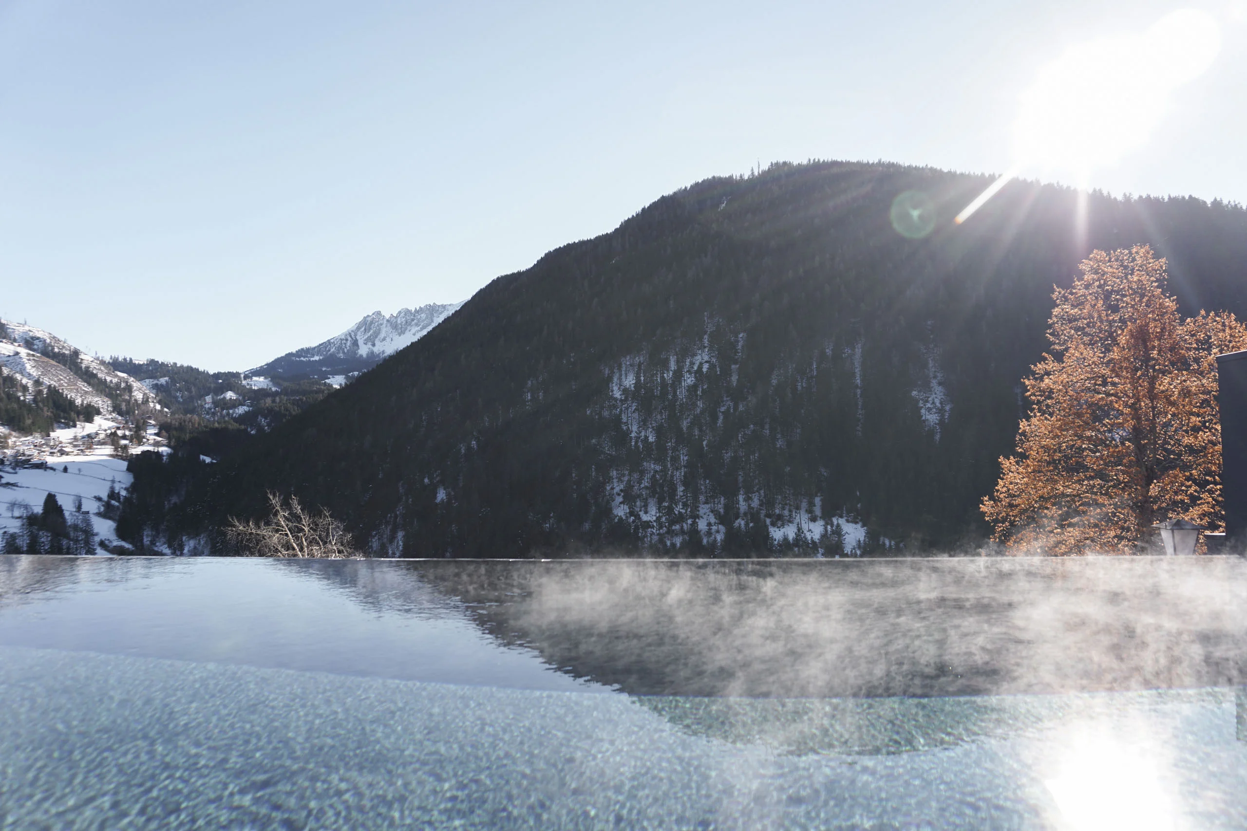 Dampfender Pool mit Bergblick und Sonne im klaren Himmel
